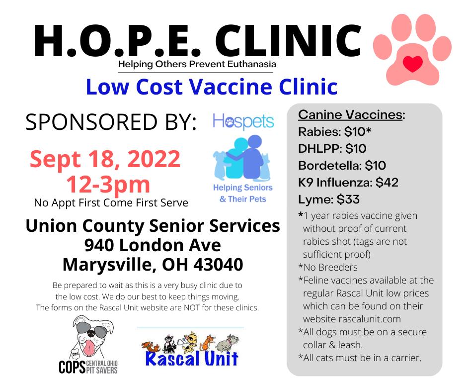 Central Ohio Pit Savers and the Rascal Unit will be hosting the next HOPE vaccine clinic at Union County Senior Services in Marysville on Sunday, September 18th from Noon until 3:00pm.