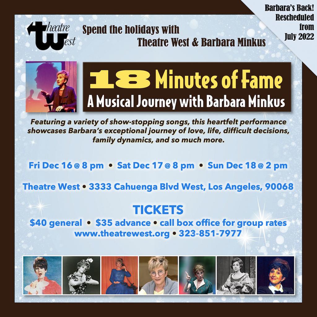 Subtitled A Musical Journey with Barbara Minkus. You’ve seen her —a lot: On stage, on screen, and especially on TV. Other than the fact that she never became actually famous, she’s had what most performers consider an enviable career. She started out and remains an accomplished singer, her show business memoir is a musical one.