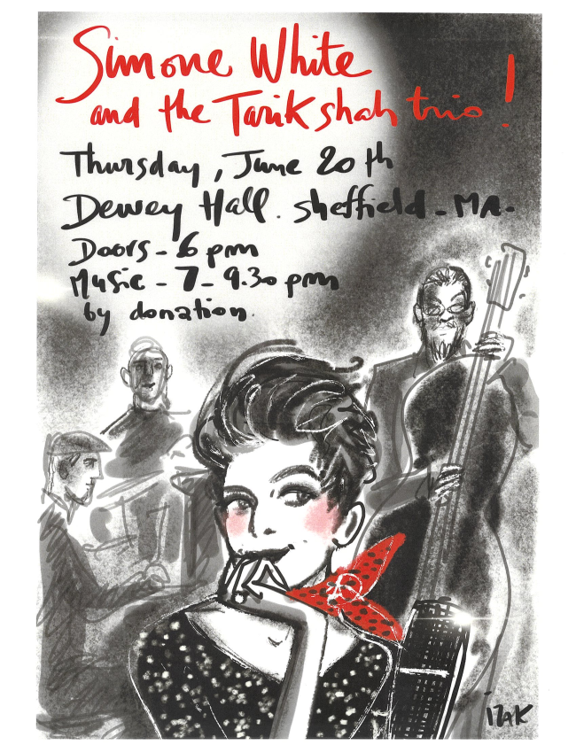Enjoy music by Norfolk resident Simone White and the Tarik Shah Trio at Dewey Hall in nearby Sheffield, MA.