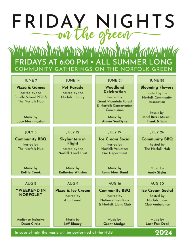 2024 Friday Nights on the Green will be here before you know it! Check your copy of the June Norfolk Now for your printed copy of the schedule. Keep it where you can see it and join the fun!