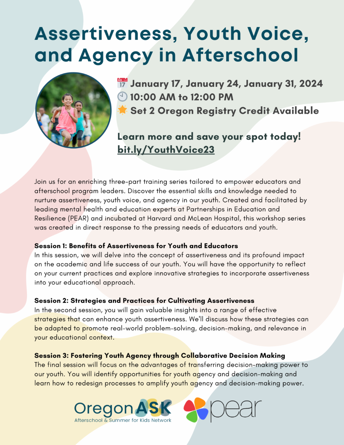 Join us for an enriching three-part training series tailored to empower educators and afterschool program leaders. Discover the essential skills and knowledge needed to nurture assertiveness, youth voice, and agency in our youth. Created and facilitated by leading mental health and education experts at Partnerships in Education and Resilience (PEAR) and incubated at Harvard and McLean Hospital, this workshop series was created in direct response to the pressing needs of educators and youth.