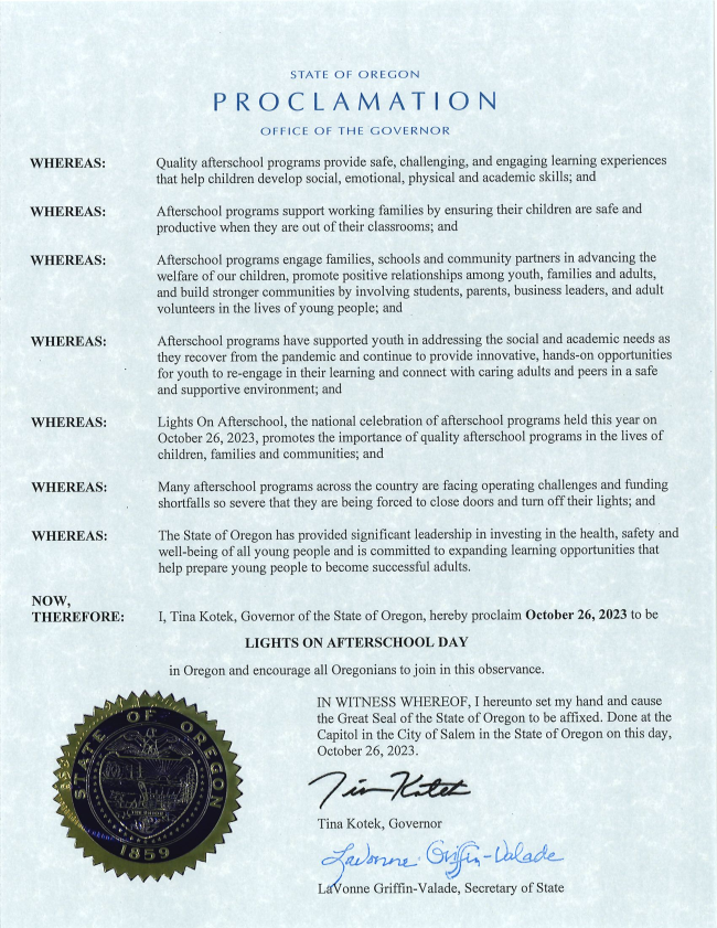 Oregon's Governor Kotek shared this years Lights On Afterschool proclamation, elevating the importance of keeping the Lights and Minds On for thousands of Oregon youth in afterschool!