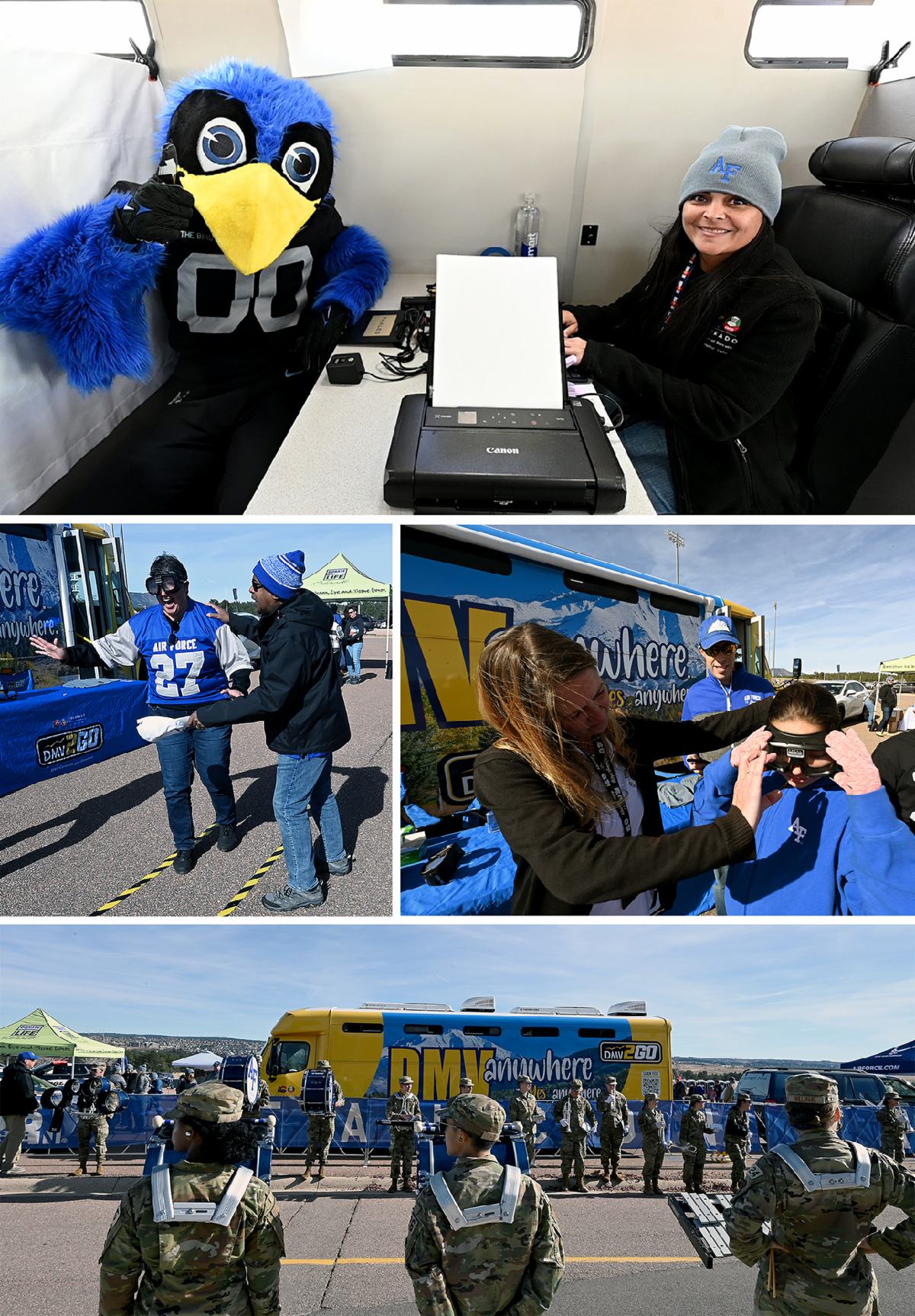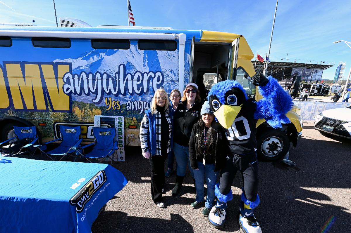 U.S. Air Force Academy's mascot, "The Bird," stopped by the DMV2GO RV to see about getting a driver license before the football game against The University of New Mexico - UNM on Nov. 12. While the DMV2GO Team couldn't issue the mascot a license, they helped dozens of Coloradans.