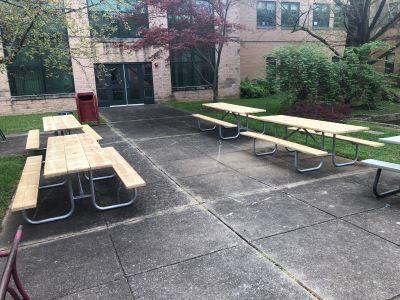 Nowadays, the space is known as the Senior Courtyard. During lunchtime seniors have access to enjoy picnic lunches or just to hang out with friends. In recent years, however, that courtyard’s facilities had deteriorated—wooden benches had outlived their useful lives, metal ones had rusted, and weeds had overgrown the lawn. In discussion with Principal Mark Brown late last summer, he indicated a priority for renovating the Senior Courtyard. To that end the Alumni Association made a gift of picnic tables as an initial investment.