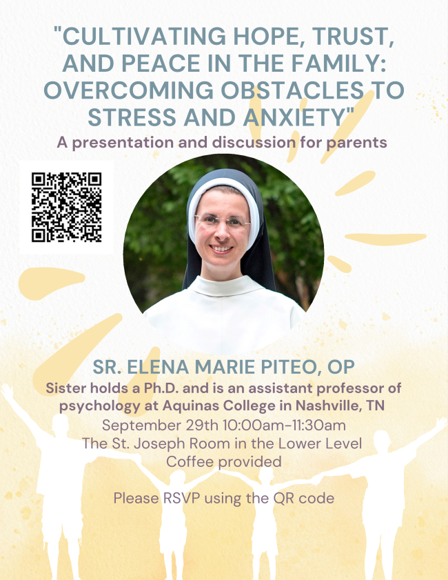 We will have a two hour late start that day, school will start at 9:45 am. Drop your children off at morning carpool and then head into the Parish Life Center for the presentation. We hope to see you there! | |