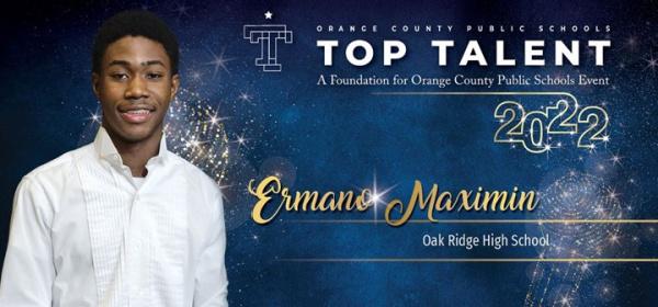 Congratulations to Ermano Maximin for being recognized as a finalist in the Performing Arts category in the annual OCPS Top Talent Showcase 2022.
