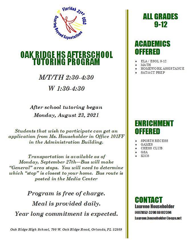 Oak Ridge High School | Mr. Alvarado, Principal | 407.852.3200 | ORHS Website