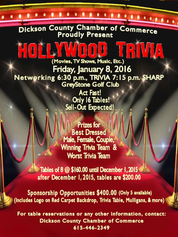 Dickson County Chamber of Commerce is proud to present our 2nd Annual Trivia Night. This years event will be held at GreyStone Golf Club on Friday, January 8, 2016. Networking will begin at 6:30 p.m. and the game begins at 7:15 p.m. sharp.