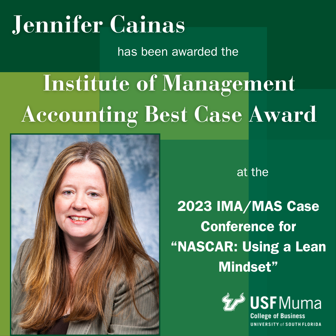 Congratulations to Jennifer Cainas, the Lynn Pippenger Faculty Teaching Fellow, and associate dean for business operations, for receiving the Institute of Management Accounting Best Case Award at the 2023 IMA/MAS Case Conference for "NASCAR: Using a Lean Mindset." | |