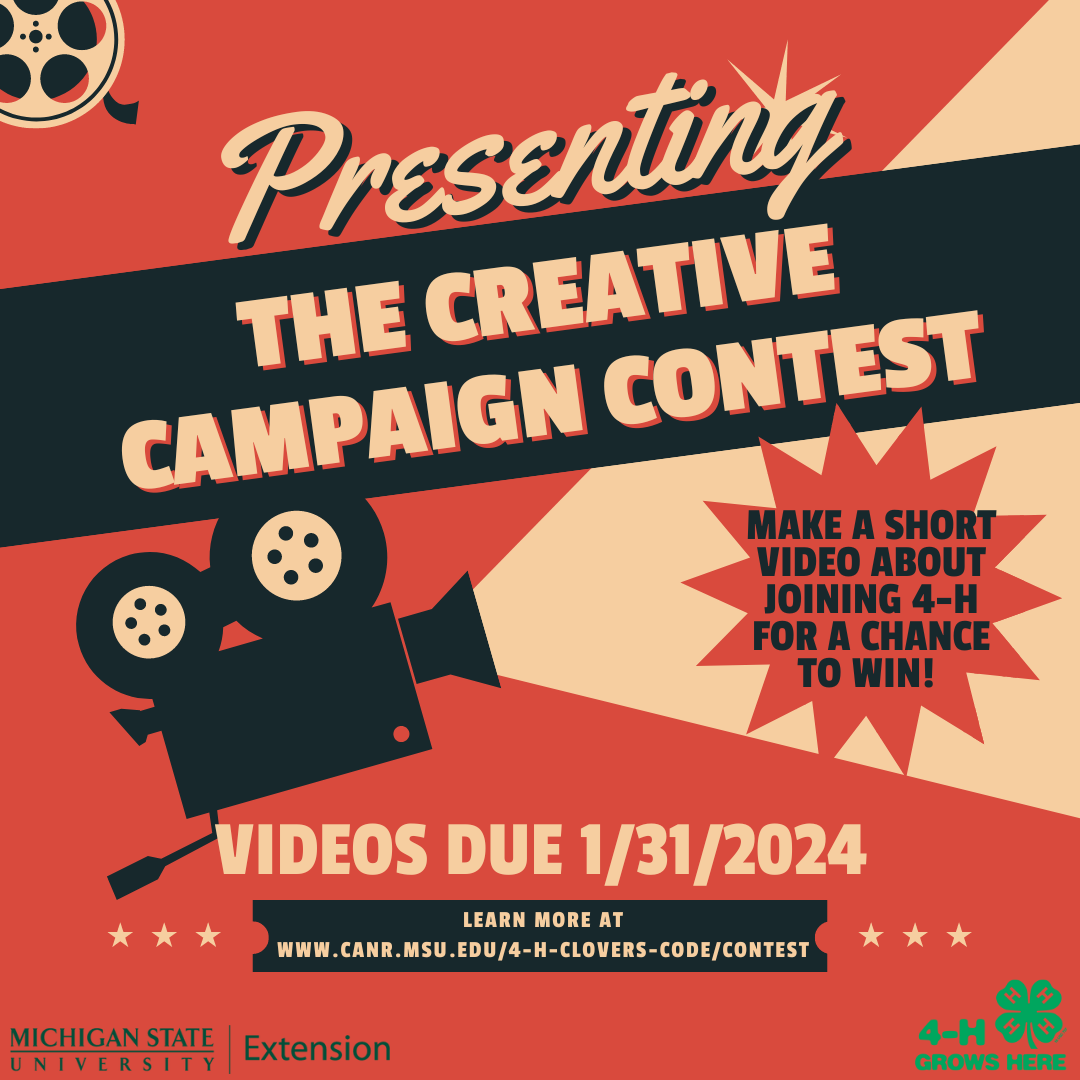 Deadline to register and submit videos is January 31, 2024. The 4-H Creative Campaign Contest is sponsored with a grant from the Michigan 4-H Foundation.