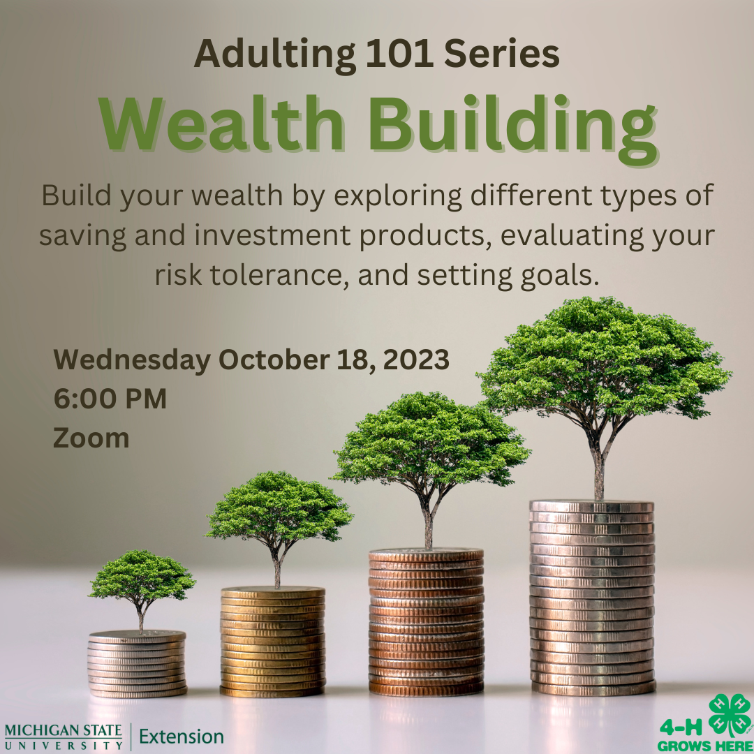 Looking for strategies to build wealth? This workshop will provide tips, tools and goal setting strategies. Learn about different types of savings and investment products. Evaluate your risk tolerance and explore investment timelines. Register here: https://www.canr.msu.edu/events/adulting101f23