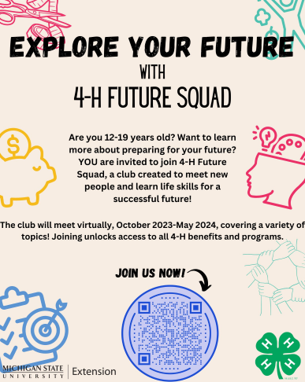 Figuring all this "adulting" out can be hard! If you are a 12-19 year old youth throughout Michigan, join 4-H Future Squad in learning more about important life skills for YOUR future.