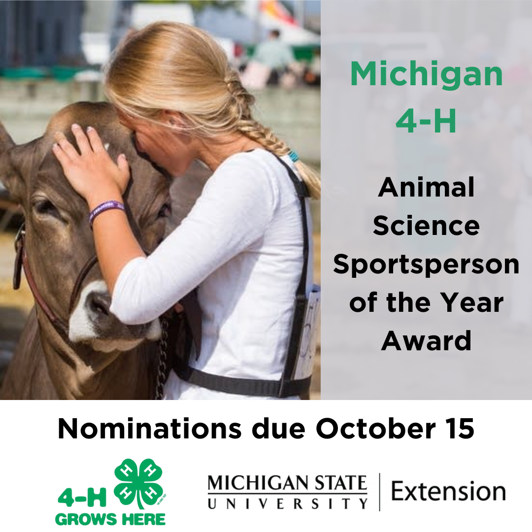 Can you think of someone who displayed extraordinary sportsmanship at a recent 4-H animal science program? Perhaps at a club meeting, clinic, or the county fair? Nominate them for the 2023 Michigan 4-H Animal Science Sportsperson of the Year Award!