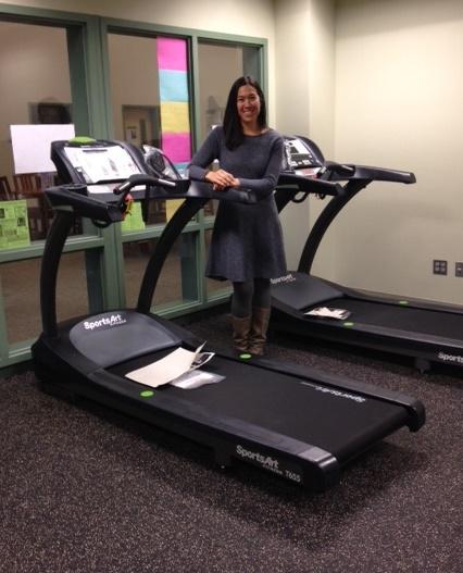 Deanna stands next to some of the fitness center equipment installed. See Community Calendar below for how to sign up for the Open Gym session!