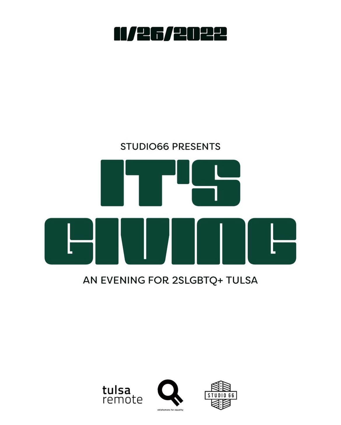 “It’s Giving,” a community solidarity potluck event sponsored by Equality Business Alliance, Studio 66, and Tulsa Remote at the Canopy followed by a drag show and dance party at the Chimera Ballroom (212 N. Main Street). The evening is meant to give back to the 2SLGBTQ+ community and strengthen ties between creative, diverse, and resilient Tulsans and those supporting them. We hope to see you there!