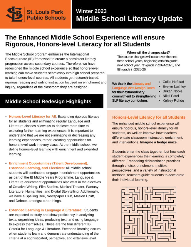 All students get research-based, rigorous reading and writing instruction focused on enrichment and inquiry, regardless of the classroom they are assigned. Expanding rigorous literacy for all students and eliminating regular Language and Literature classes allows us to dedicate more time to exploring further learning experiences. It is important to understand that we are not eliminating or decreasing any learning experiences, rather, creating opportunities for honors-level work in every class. The course changes will occur over the next three school years, beginning with 6th grade next school year, 7th grade in 2024-2025, and 8th grade in 2025-26.