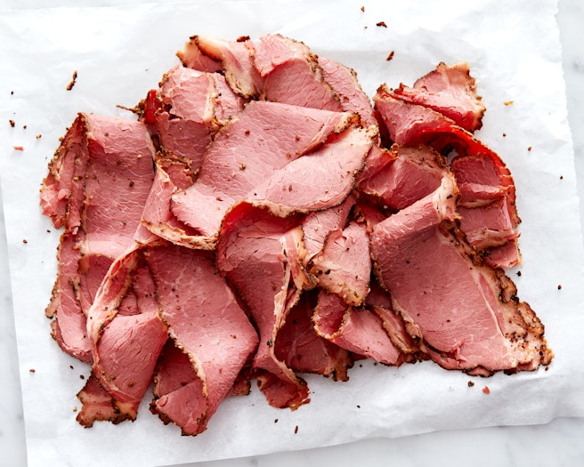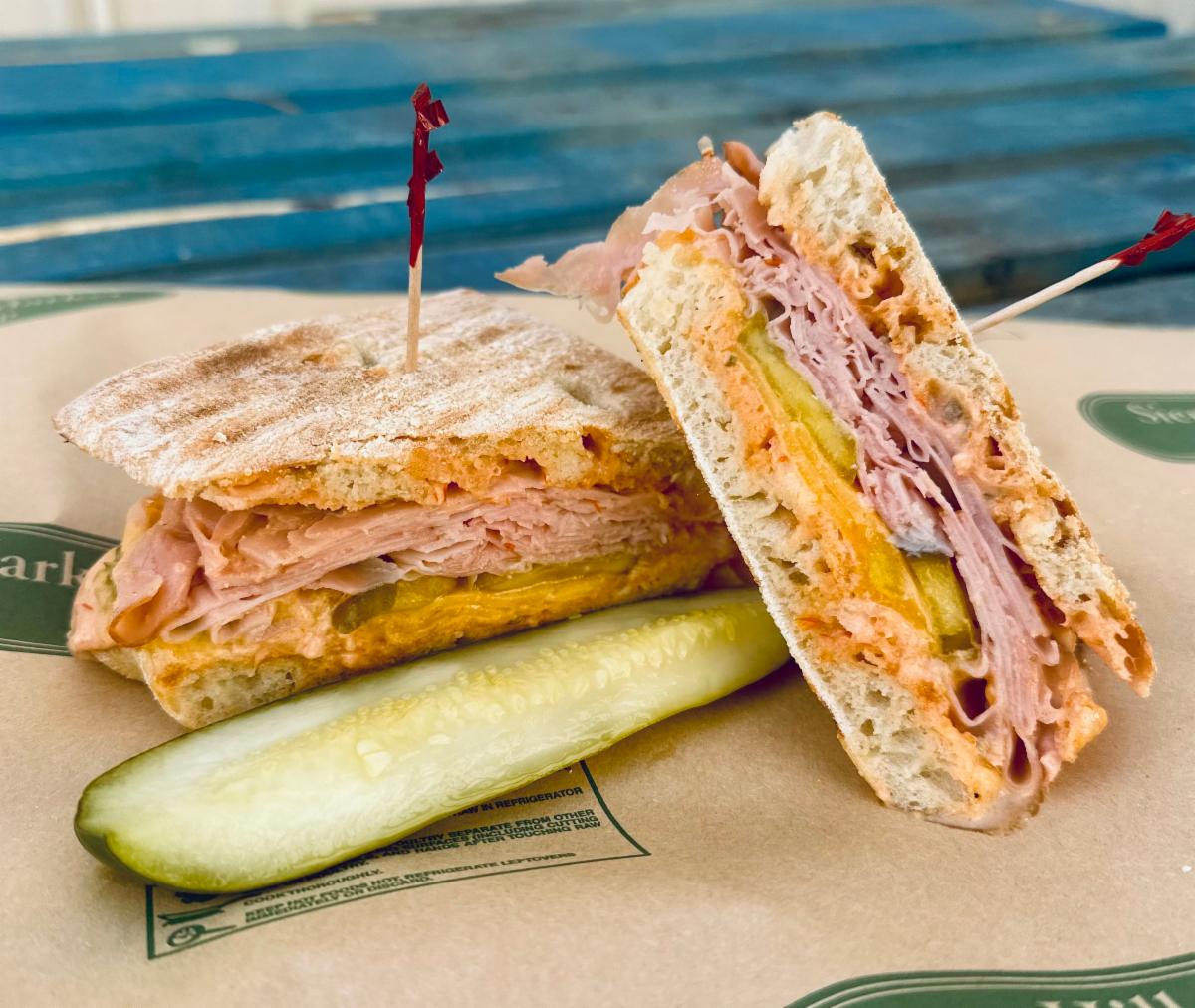 Applewood Ham, Sharp Cheddar Cheese, Bread & Butter Pickles with Russian Dressing Grilled on Focaccia Bread.