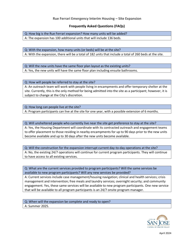 Our office would like to provide additional details regarding the site expansion for the Rue Ferrari Emergency Interim Housing Community. The City's Housing Department has provided this Frequently Asked Questions document for your information. We will continue to share details and meetings as they become available. | |