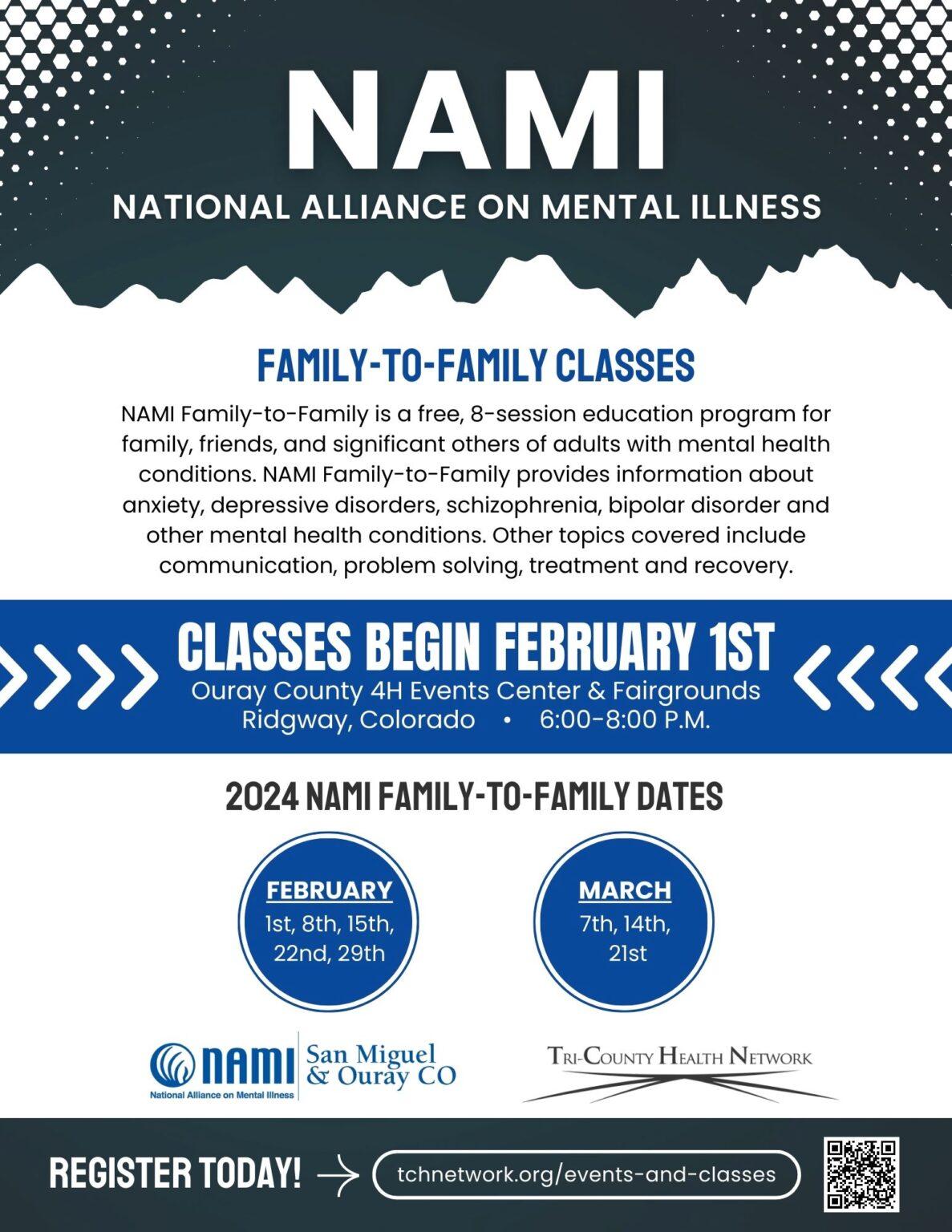 The course is designed to increase understanding and advocacy skills while helping participants maintain their own well-being. The program is taught by trained family members who have a loved one with a mental health condition. NAMI Family-to-Family is an evidence-based program (EB).NAMI Family-to-Family is a free, 8-session education program for family, friends, and significant others of adults with mental health conditions. NAMI Family-to-Family provides information about anxiety, depressive disorders, schizophrenia, bipolar disorder and other mental health conditions. Other topics covered include communication, problem solving, treatment and recovery.