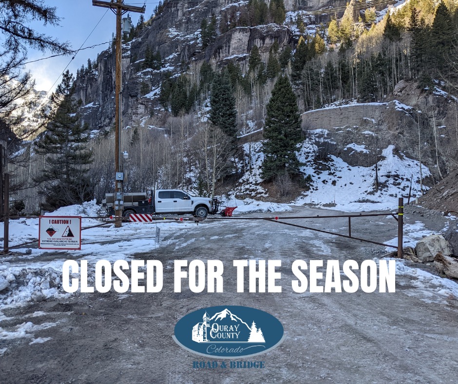 Effective Dec 22: CR-361 / Camp Bird road at Senator Gulch closed for the season. | |