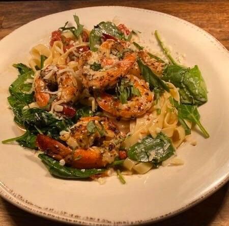 Tuscan Shrimp pasta with wild caught Texas gulf shrimp, spinach, roasted tomatoes and creamy garlic, white wine sauce. Garnish of roasted acorn squash. $26
