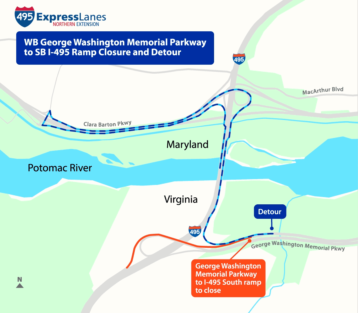 - Detour: Motorists will be detoured to I-495 south general purpose lanes where they will proceed to exit 46B to access Route 123 North and then take the exit for I-495 North general purpose lanes. Motorists will continue on I-495 North general purpose lanes to Georgetown Pike (Exit 44).