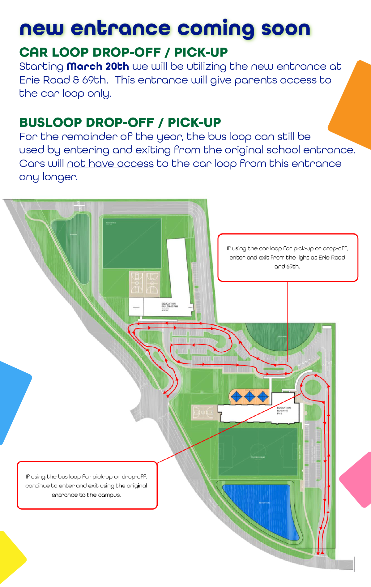 Lastly, on a different subject, we will be opening our new entrance AFTER SPRING BREAK. Please pay attention to the map and directions given. Those that normally pick up in the bus loop will continue to use the original entrance and exit the same way. Those that pick up in the back loop will need to use the new entrance at the light and will be directed through the new lot and pick up at the back car line. You will exit through the new exit/light.