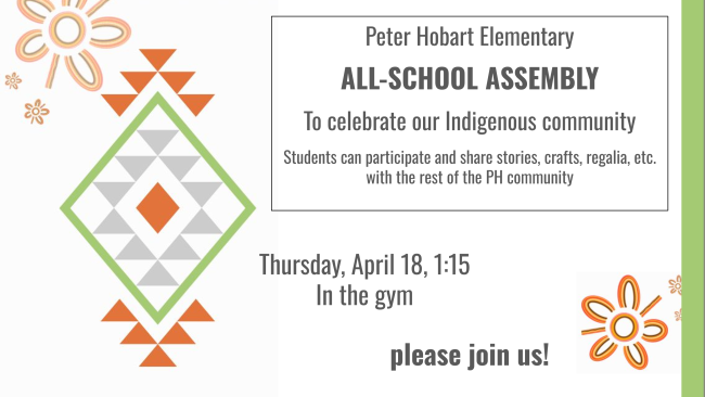 Thursday, April 18 ~ TODAY Peter Hobart All School Assembly to celebrate our Indigenous Community 1:15pm PH Gym