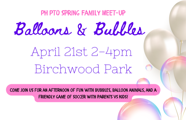 Sunday, April 21 ~ PTO Family Meet up- Balloons and Bubbles, 2-4 PM Birchwood Park