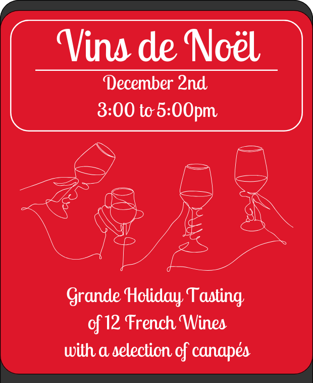 Join us this Saturday, 3-5:00 PM, for an exciting event - the Vins de Noël Grande Tasting. Immerse yourself in the delightful world of French wines during our open-house format. We've carefully selected 12 exquisite wines from renowned regions like Champagne, Burgundy, Bordeaux, the Loire, and the Rhone Valley.