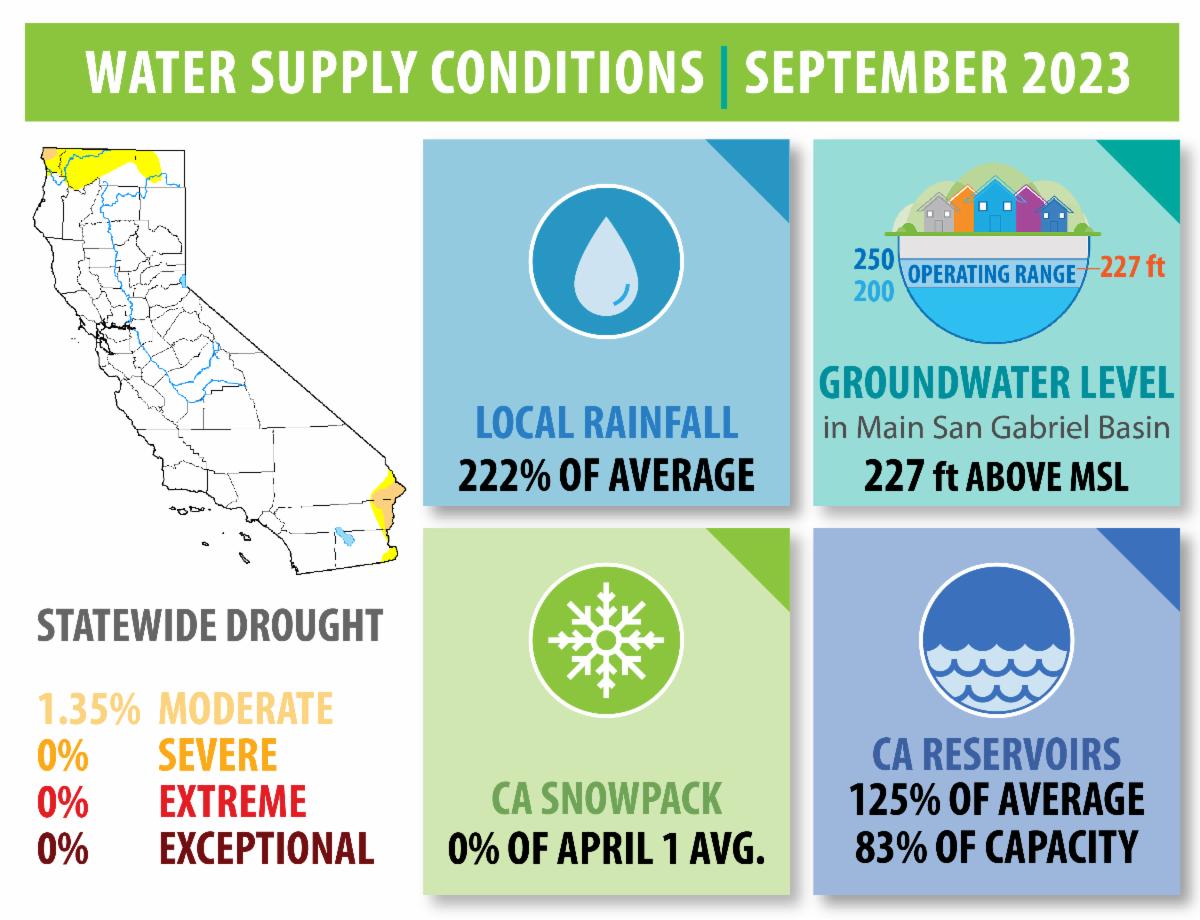 The graphics above show the marked improvement from January through September 2023 in state and local reservoir, snowpack and groundwater conditions, including significant lessening of drought conditions statewide. Local groundwater, which improves more slowly due to the time it takes stormwater runoff to percolate down to groundwater levels, has risen more than 50 feet year-to-date!