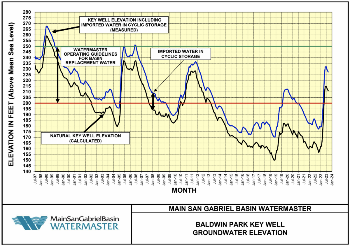 Prior to the storms earlier this year, the Basin had experienced a steady decline in groundwater levels from a high of 212.5 feet above mean sea level in December 2019 and was trending downward toward the historic low of 169.4 recorded on November 21, 2018. One vertical foot is equivalent to about 8,000 acre-feet of groundwater in the Main Basin. Watermaster’s operating guidelines for replacement water or “safe yield” is between 200 and 250 feet above mean sea level.