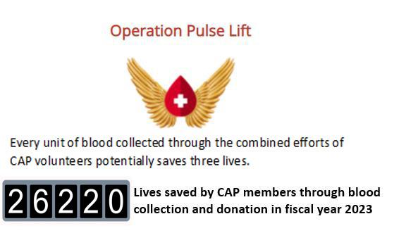 For more information, go to Operation Pulse Lift's new webpage on GoCivilAirPatrol.com. There you will find the latest Blood Donation Center schedules, instructions on how to set up a BDC, and other mission information. | |