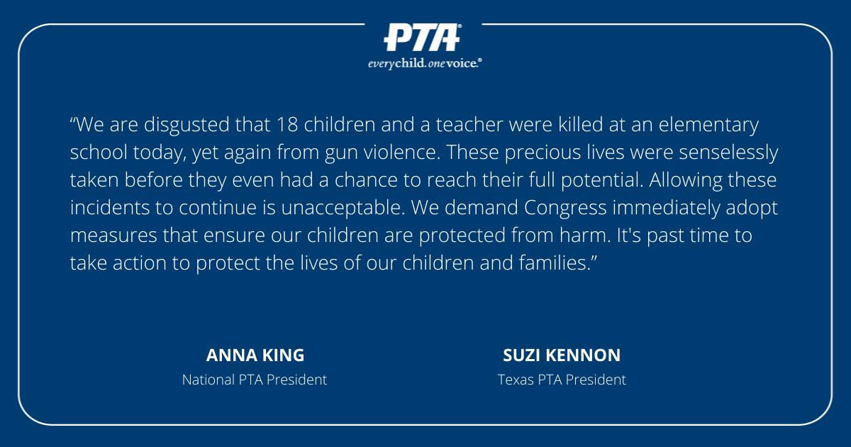 California State PTA stands with National PTA and Texas PTA as one voice demanding safe schools for every child in our nation. We must put an end to gun violence and provide support for our children and families impacted by this trauma.