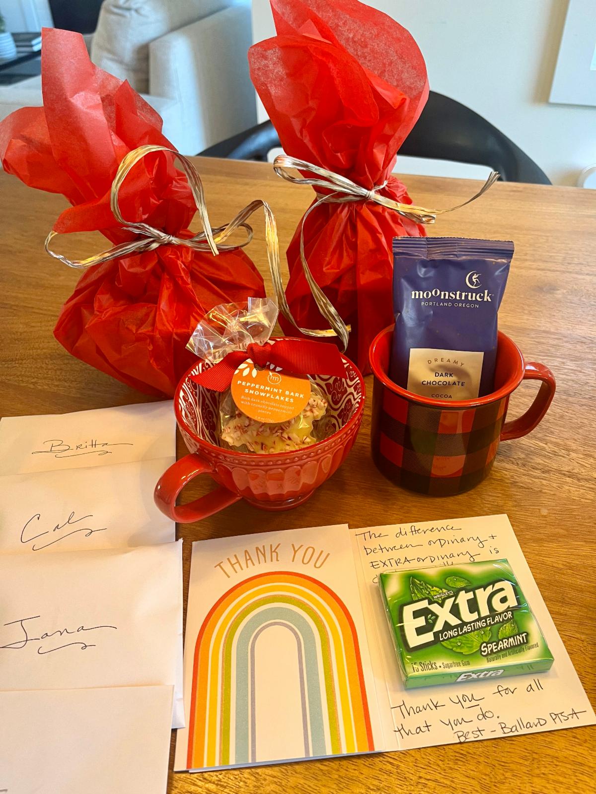 The mugs were accompanied by handwritten cards that included a package of Extra gum: "The difference between ordinary and EXTRAordinary is just a little 'EXTRA' Thanks for all you do. - Ballard PTSA."