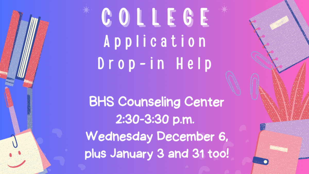 Drop-in help is available in the Counseling Center on the following Wednesdays after school (2:30-3:30 p.m.):
