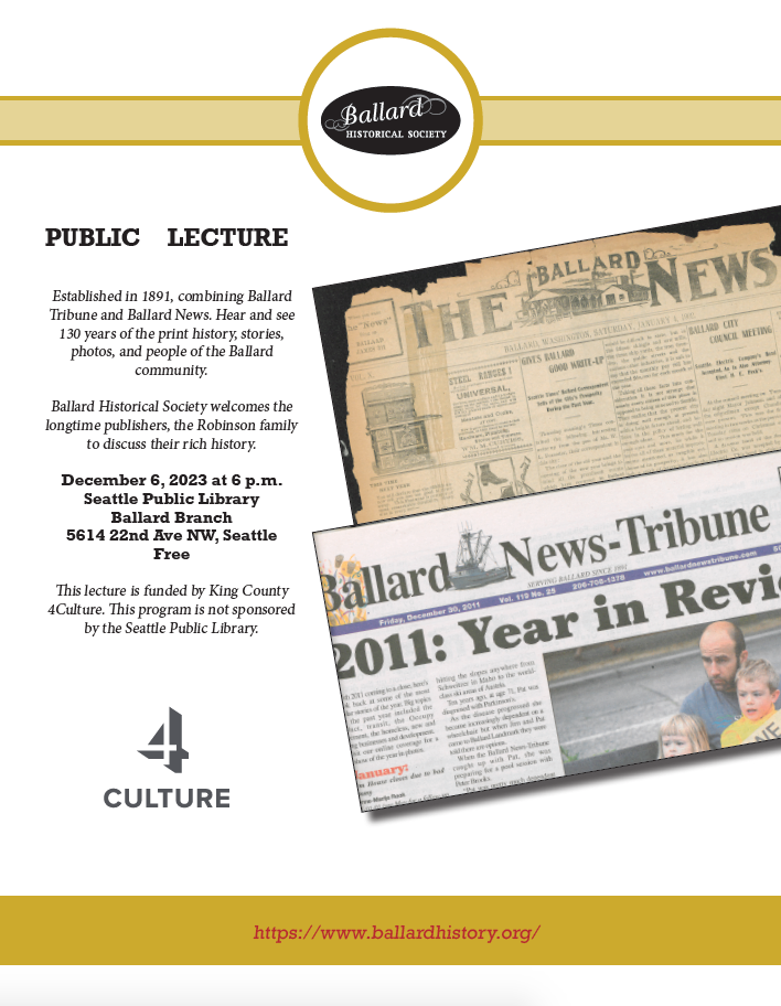 The Ballard Historical Society will be hosting a free lecture featuring the Robinson Family (publishers of the Ballard News-Tribune) at 6 p.m. Wednesday, Dec. 6 at the Ballard Branch of Seattle Public Library (5614 22nd Ave. N.W.)