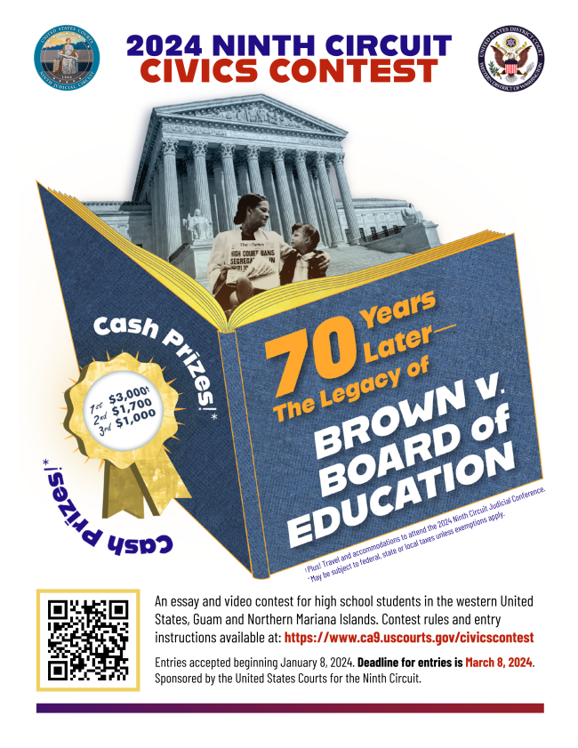 Ninth Circuit Essay and Video Contest | 2024 marks the 70th anniversary of the U.S. Supreme Court’s 1954 landmark decision in Brown v. Board of Education. Students are invited to submit an essay and/or video reflecting on the legacy of this decision for cash prizes. Deadline March 8. Full details