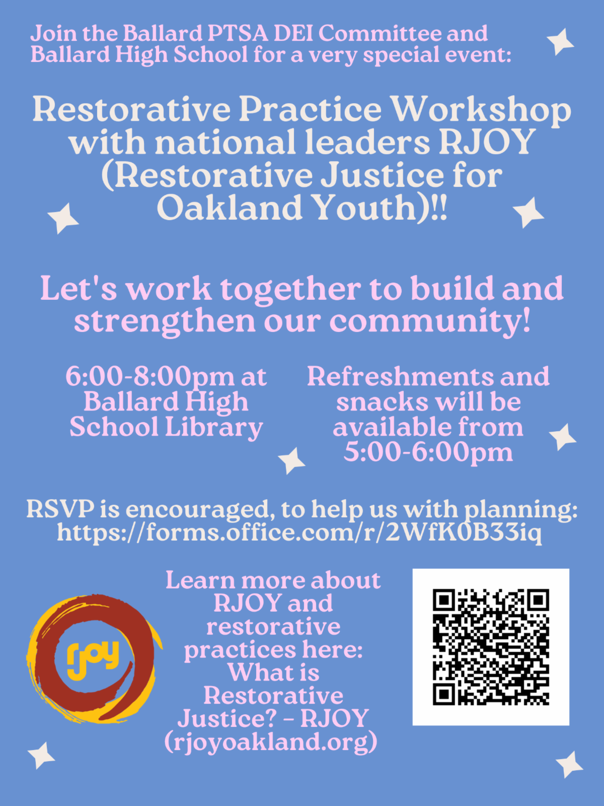 May 22 from 6-8 p.m.: Join the Ballard PTSA DEI Committee and Ballard High School for a very special event: Restorative Practice Workshop with national leaders RJOY (Restorative Justice for Oakland Youth).
