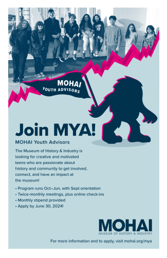 MOHAI Youth Advisors (MYA) is a 10-month program that takes place during the school year. Youth Advisors make the museum more welcoming for their peers by finding fun and creative ways to connect teens with MOHAI, and providing input on the development of museum programming and exhibits. Youth advisors work together to choose and build their own projects and activities. MYA also interact with MOHAI staff to learn more about the behind-the-scenes work of a museum and dive deeper into local history. This team of 12 high school students meet regularly from September-June and are offered a $100 monthly stipend.