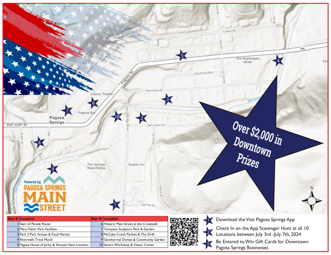 This Fourth of July weekend, Pagosa Springs Main Street Advisory Board invites residents and visitors to participate in an exciting downtown scavenger hunt. Available on the Visit Pagosa App from Wednesday, July 3, 2024, through Sunday, July 7, 2024, the event promises to be a fun-filled adventure for all ages.