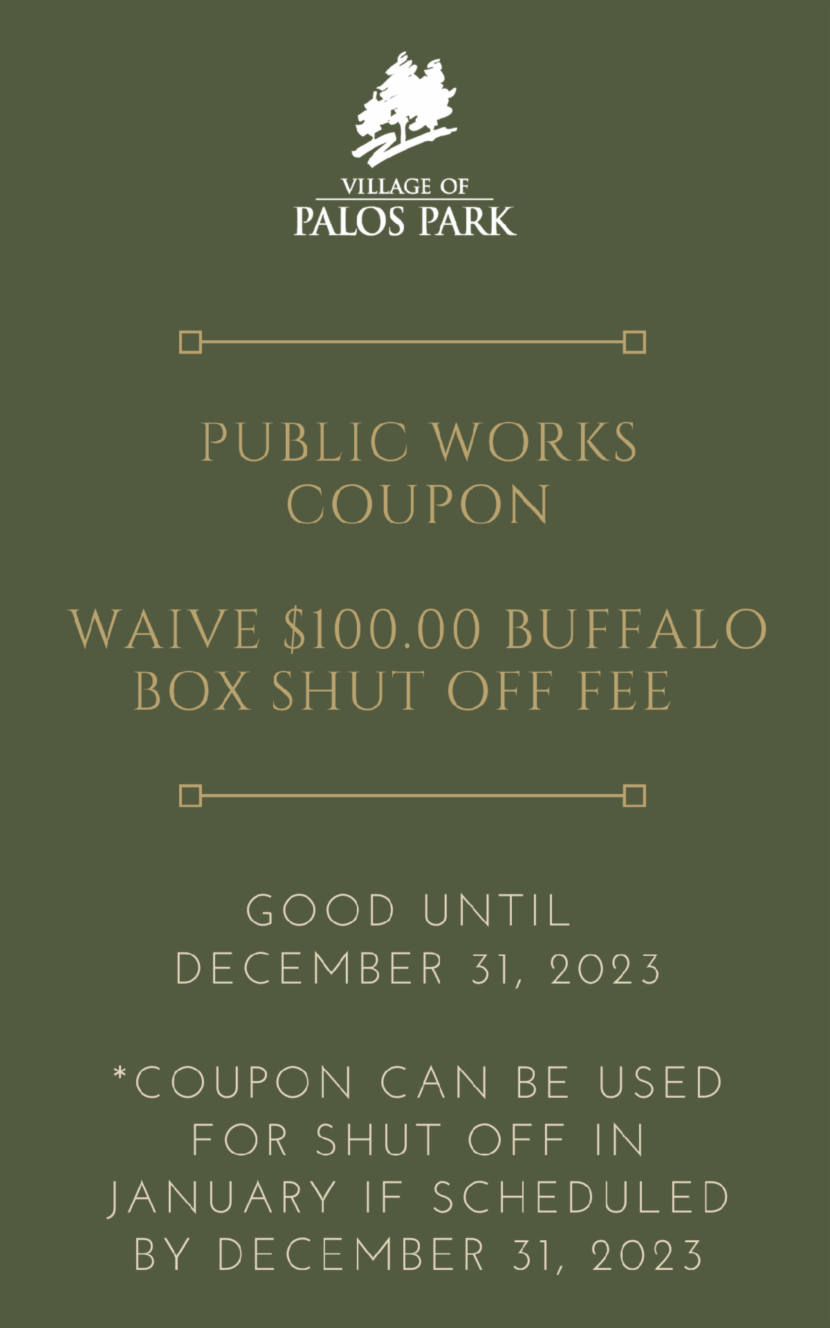 Bring this coupon in to The Village hall to waive the $100.00 shut off fee for turning off the water at the Buffalo Box while you are out of town.