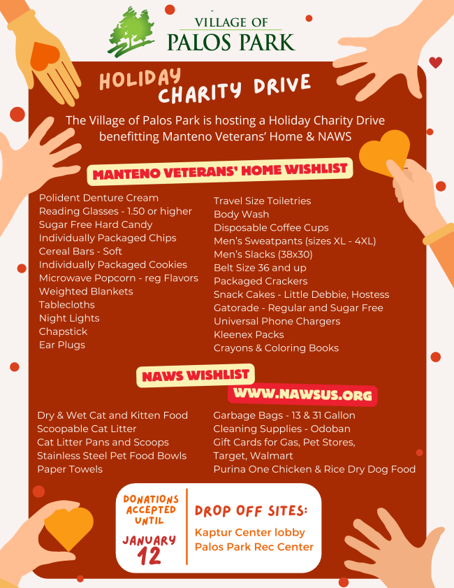 The cadets will accept donations at the Palos Park Police Department located at 8999 W. 123rd Street. Donations are accepted from November 1st, through January 1st. This is another way to give back to the community and help families that are in need.