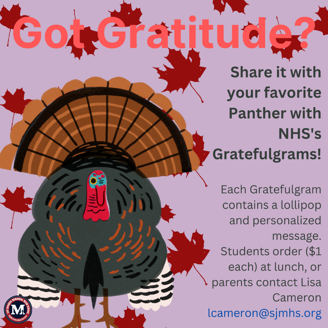 Do you have someone that you’re thankful for this November? Memorial’s National Honor Society is hoping to help you show them how grateful you are with our Grateful-grams! Starting next week, you can write a personalized message and send a friend a tootsie pop for a dollar. Orders can be placed at lunch in front of the cafeteria, and will be delivered on Monday, November 14 in homeroom. Parents you can also place your orders with Mrs. Cameron at lcameron@sjmhs.org! We’re already grateful for all of you and your support! | |