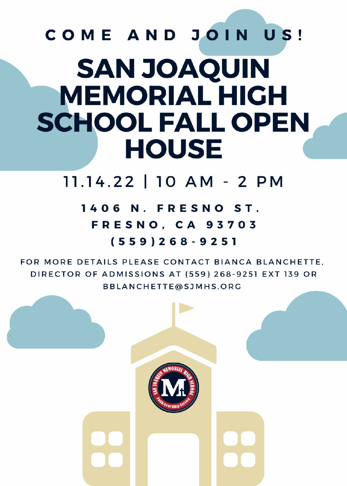 The SJM 2023-2024 Application for incoming freshmen and spring transfers opened on Tuesday, November 1, 2022 on the SJM website. Help us spread the word by passing this information on to prospective parents and students! For assistance on the application process or to schedule a tour of the SJM Campus, contact Bianca Blanchette, Director of Admissions at (559) 268-9251 EXT 139 or bblanchette@sjmhs.org ! | |