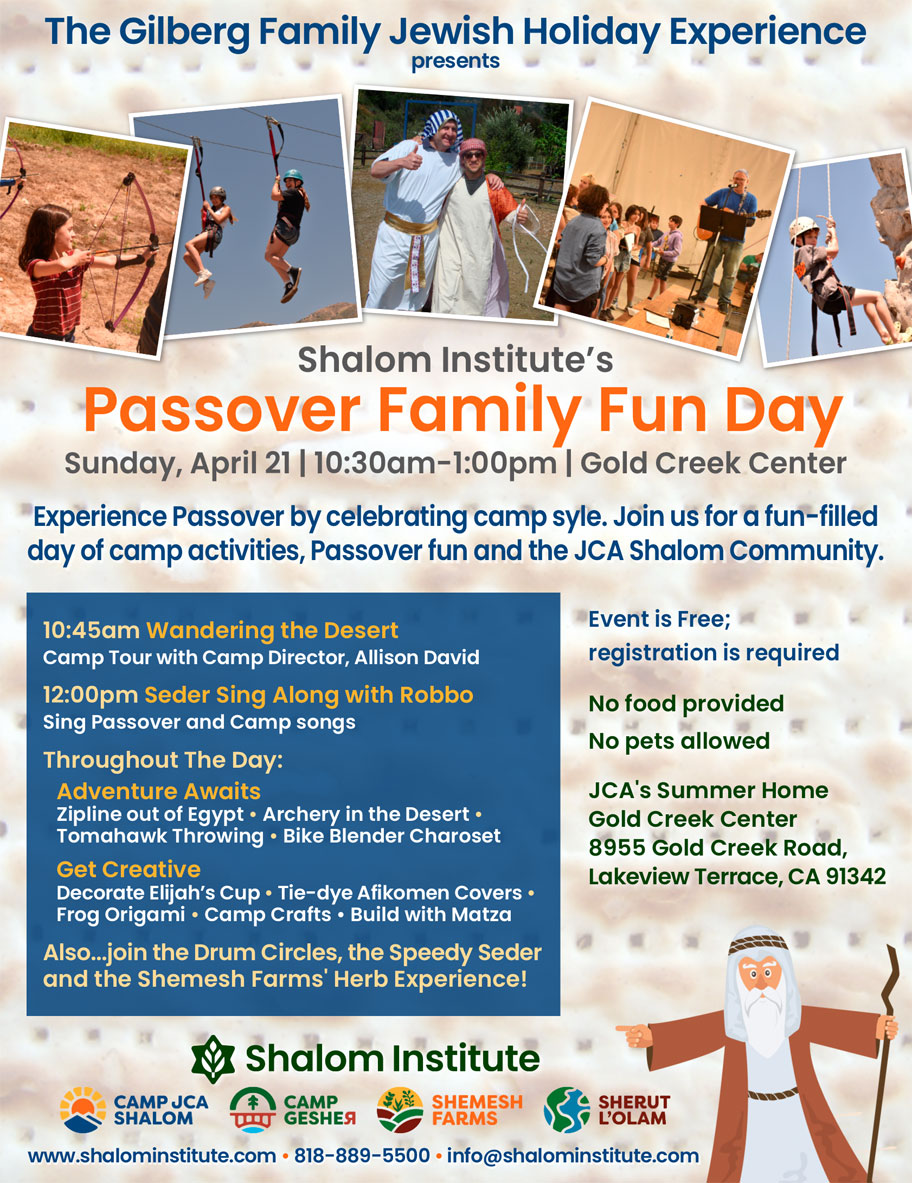 Join Shalom Institute on Sunday, April 21st as we wander the desert to explore camp, sing Passover songs with Robbo, and enjoy Passover-themed camp adventures including ziplining, archery, awesome crafts, and drum circles. It's a fun-filled, free event ~ see you on Sunday, April 21st