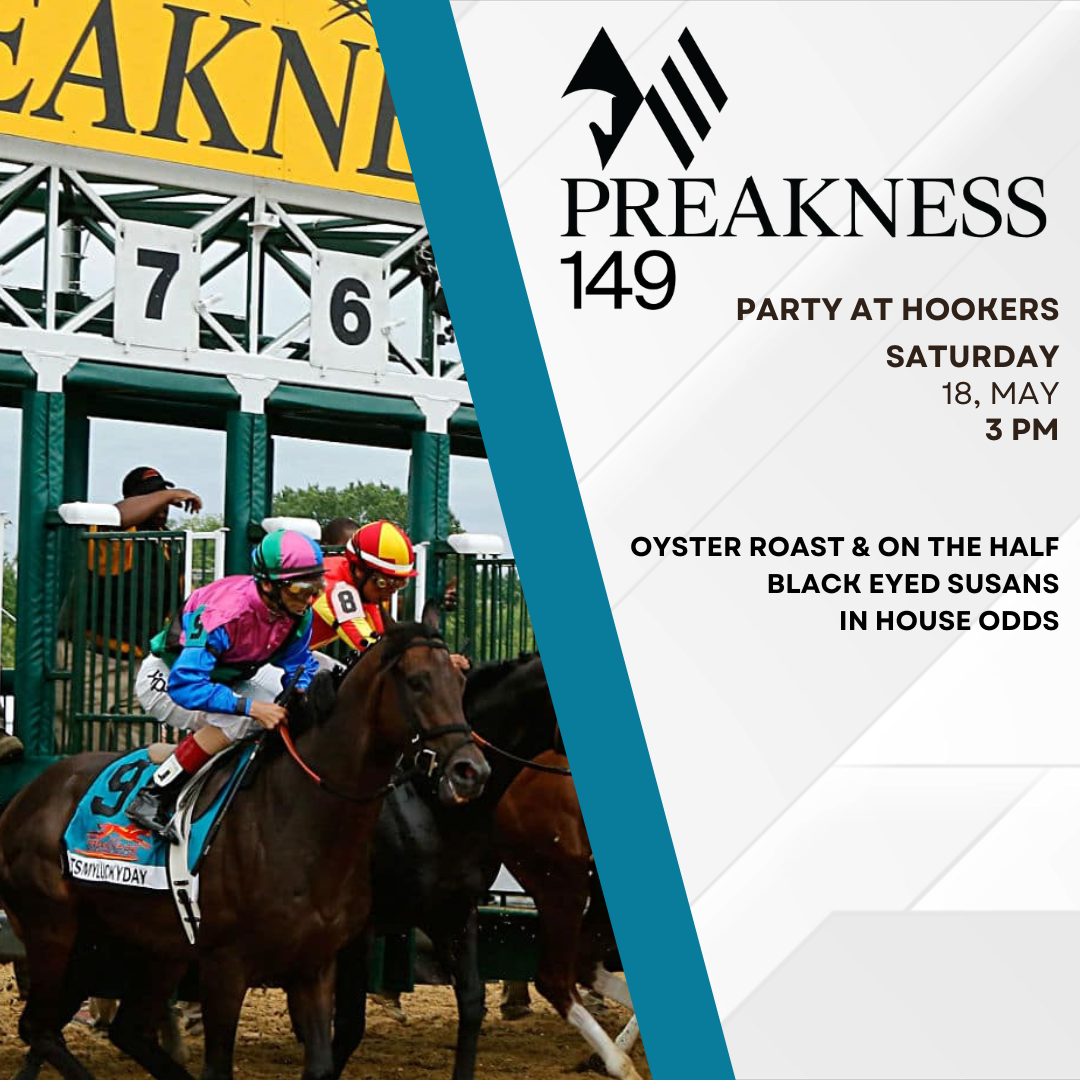 This weekend is the 2nd leg of the Triple Crown Horse Races, with the 149th running of the Preakness Stakes. We will be serving raw and grilled oysters on Hooker's Bar Patio on Saturday starting at 3 pm throughout the race or while they last. So dress up in your favorite horse racing attire and come out to Hooker's to cheer Mystic Dan onto victory.