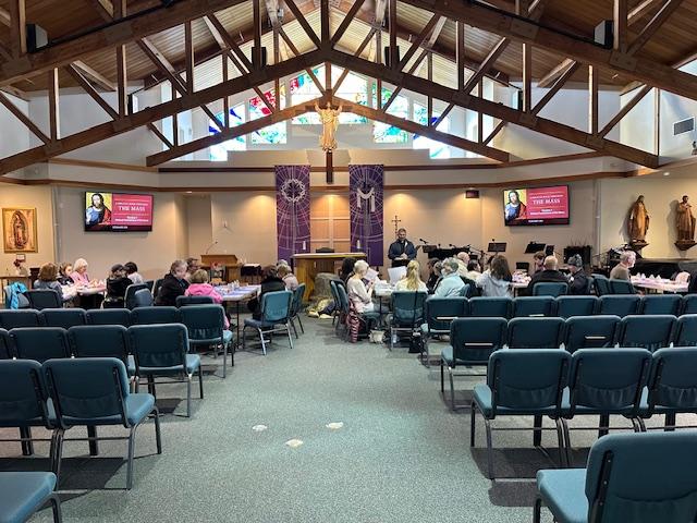 When we are in the church (specifically in the presence of the Blessed Sacrament), we should keep our volume to a reverential whisper, if conversation is necessary. This is to promote prayer to prepare our hearts and minds for Mass. Thank you for your mindfulness.