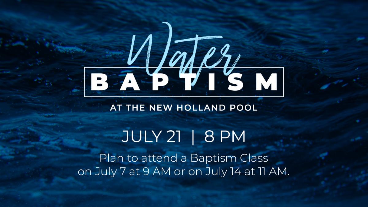 Are you ready to take the next step in your spiritual walk? If you’ve accepted Jesus Christ as your personal Savior but have not yet been water-baptized, you can do that on Sunday, July 21, at 8 p.m. at the New Holland Pool. Register below or at the Resource Hub on a Sunday and plan to attend the Baptism Class on Sunday, July 7, at 9 a.m. or Sunday, July 14, at 11 a.m.