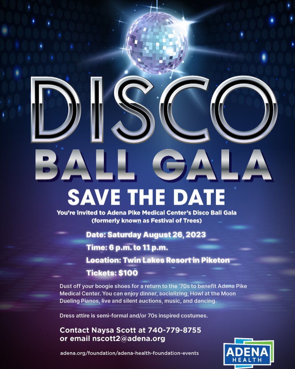 The Adena Health Foundation is offering you the chance through Adena Pike Medical Center’s 2023 Disco Ball Gala to relive the 1970s or, for those in younger generations, immerse yourself for the first time in the era in which disco ruled. Formerly known as the Festival of Trees, this year’s event has been moved earlier in the year, taking place from 6 to 11 p.m. Saturday, August 26, at Twin Lakes Resort, 273 Tackett Road in Piketon.